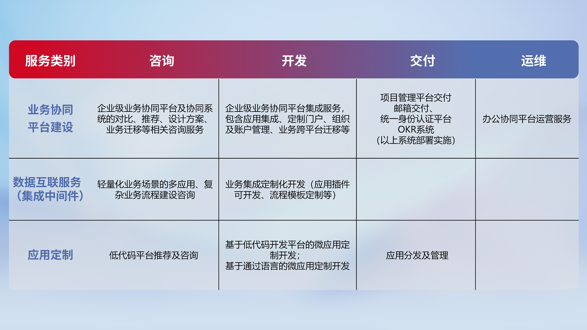 针对钉钉、、、企微、、、IDaas等平台级产品提供产品的规划、、方案、、交付、、、、定制化开发等服务,,,,实现如统一协同办公、、、、智能客户服务、、、、混合会议管理、、、智能数据查询、、等业务场景,,,实现数字化转型。。。