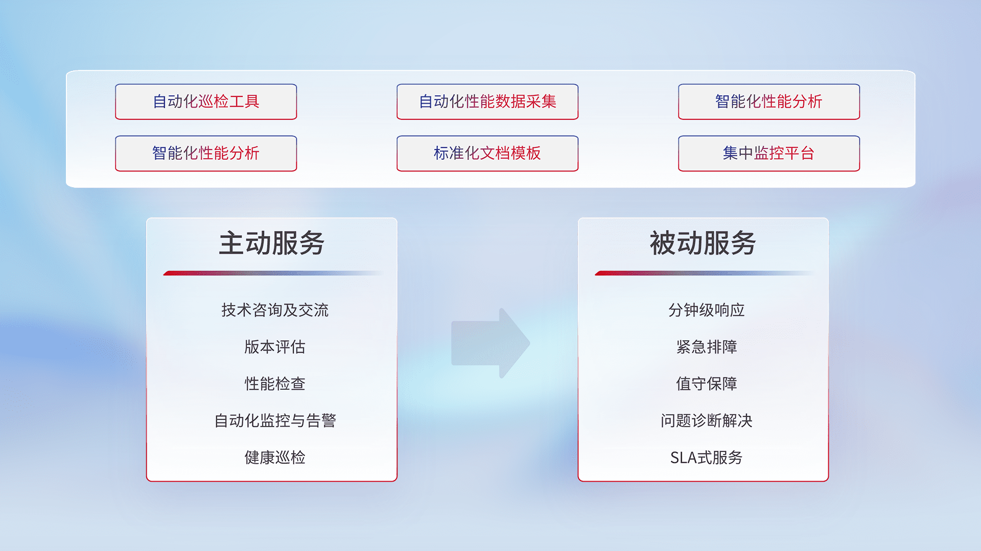 智能化工具和标准化文档,,,,保障服务质量,,,提供主动服务(包含技术咨询、、版本评估、、、性能检查、、、自动化监控与告警、、健康巡检)和被动服务包含(分钟级响应、、紧急排障、、值守保障、、问题诊断解决、、、、SLA服务)。。。